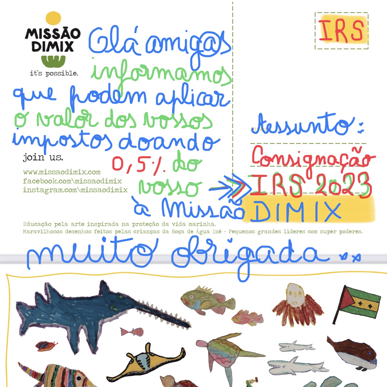 Informamos que podem aplicar o valor dos vossos impostos doando 0,5% do IRS 2023 à Missão Dimix, apoiando as nossas atividades.